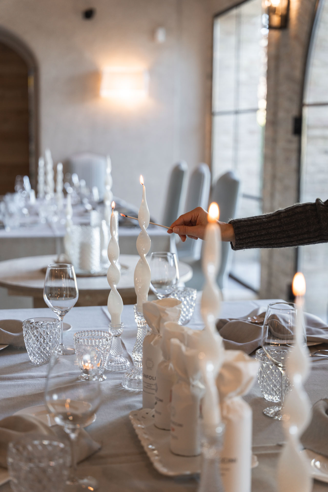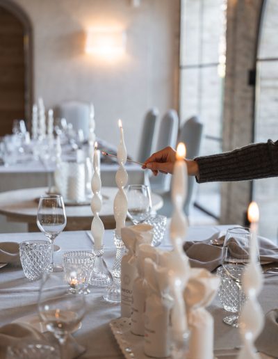 I tavoli sono apparecchiati con porcellane raffinate, tovaglie bianche e candele accese, pronti ad accogliere gli ospiti. Le sedie imbottite offrono comfort, mentre un moderno lampadario aggiunge un tocco contemporaneo all’arredamento classico. La palette di colori neutri crea uno sfondo sereno per conversazioni intime e cene indimenticabili.